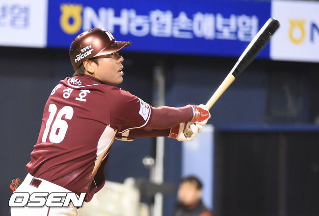 5일 오후 창원시 마산구장에서 열린 '2014 한국야쿠르트 세븐 프로야구' NC 다이노스와 넥센 히어로즈 경기, 7회말 무사 만루 강정호 동점 2타점 적시타를 날리고 있다.