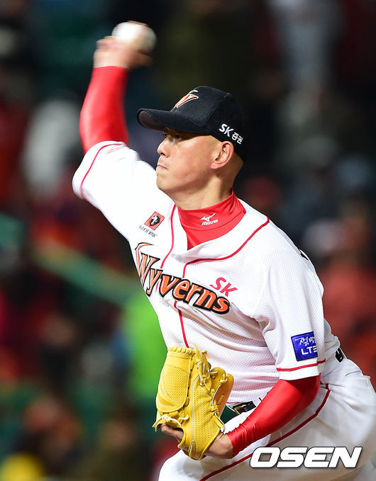 8회초 무사에서 SK 박정배가 힘차게 공을 던지고 있다.