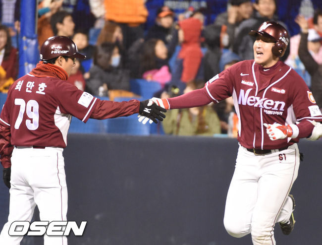5일 오후 창원시 마산구장에서 열린 '2014 한국야쿠르트 세븐 프로야구' NC 다이노스와 넥센 히어로즈 경기, 7회초 2사 3루 유한준 투런 홈런을 날리고 최만호 코치의 환영을 받으며 홈인하고 있다.