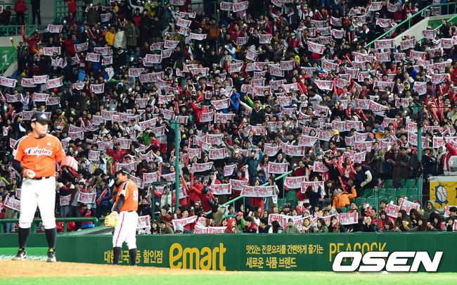 8회초 SK 팬들이 은퇴식을 앞둔 SK 박경완 2군 감독을 응원하는 26번 영구결번 기념 수건을 들고 응원을 하고 있다.