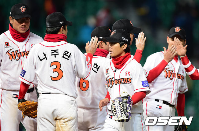 경기 종료 후 SK 선수들이 승리의 기쁨을 나누고 있다./sunday@osen.co.kr