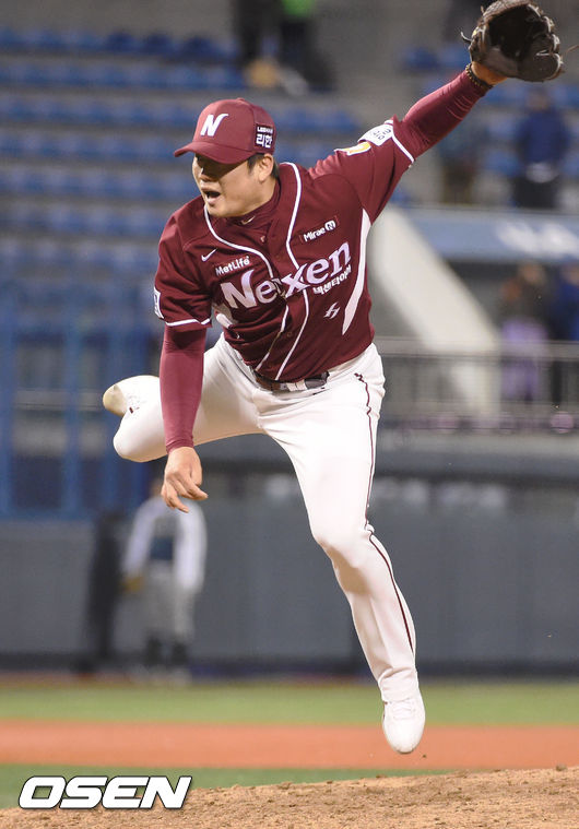 5일 오후 창원시 마산구장에서 열린 '2014 한국야쿠르트 세븐 프로야구' NC 다이노스와 넥센 히어로즈 경기, 9회말 넥센 소방수 손승락이 공을 뿌리고 있다.