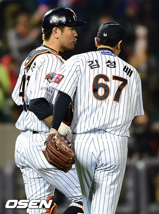 경기를 마치고 롯데 강민호와 김성배가 하이파이브를 하고 있다./ rumi@osen.co.kr