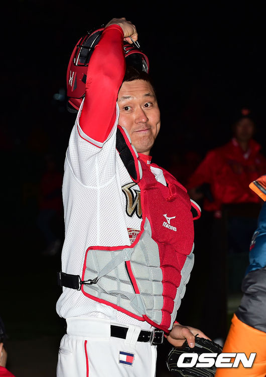 은퇴식에서 박경완이 2010년 삼성과의 한국시리즈 당시 우승을 결정짓는 삼진을 잡은 뒤 김광현과의 포옹 장면을 재연을 위해 포수 장비를 착용하고 있다. /ouxou@osen.co.kr