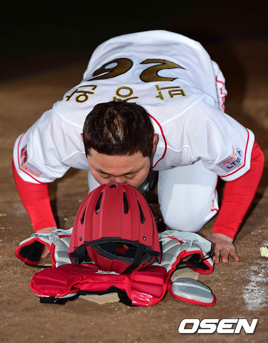 은퇴식에서 박경완 SK 2군 감독이 포수 장비에 키스를 하고 있다./sunday@osen.co.kr