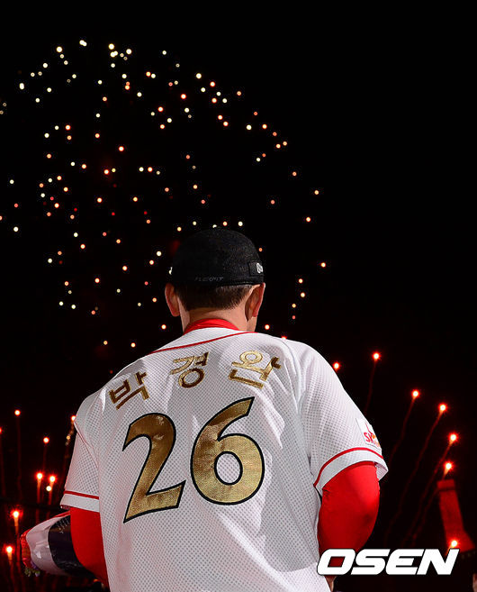 제시카의 'Goodbye'가 문학구장에 흘려퍼지는 가운데, 박 감독은 경기장을 한 바퀴 돌며 팬들에게 손을 흔들었다. 그리고 선수단과도 일일이 악수를 나눴다. 박 감독의 앞길을 축복하는 화려한 불꽃놀이와 함께, SK의 26번은 이제 프로야구 역사에 길이 남을 전설이 됐다.