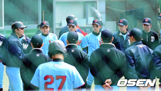 5일 오후 서울 신월동 신월야구장에서 '2014 고교 주말리그' 휘문고와 서울고의 경기, 휘문고 선수들이 코치의 이야기를 듣고 있다.