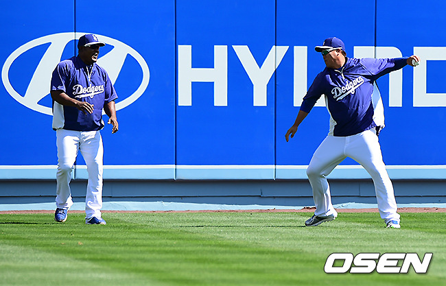 경기에 앞서 유리베가 외야에서 몸을 풀던 류현진에 다가와 음악에 맞춰 춤 추기를 권했다. 유리베의 장난을 계속되자 류현진이 볼을 던지고 있다.