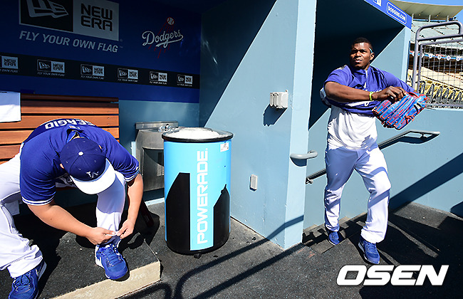 경기에 앞서 푸이그가 몸을 풀기 위해 그라운드에 들어서고 있다.