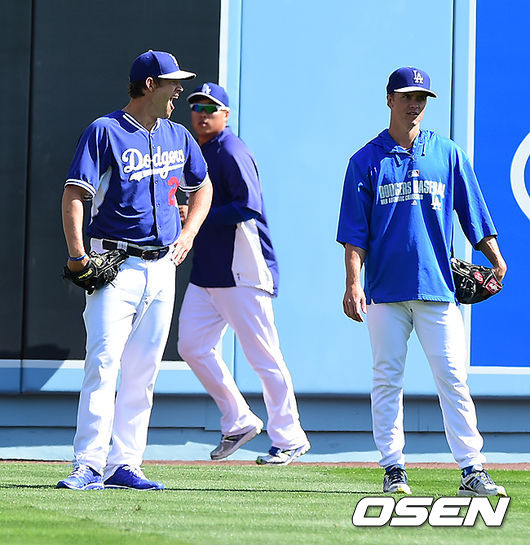 경기에 앞서 다저스 류현진이 외야에서 러닝을 하며 하품하는 커쇼를 바라보고 있다.