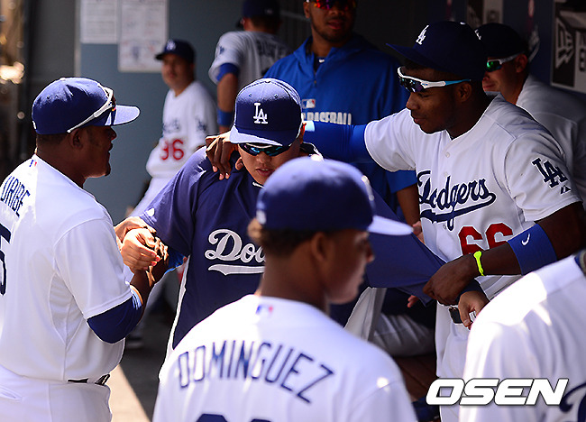 경기에 앞서 다저스 유리베, 푸이그가 류현진과 장난을 치고 있다.