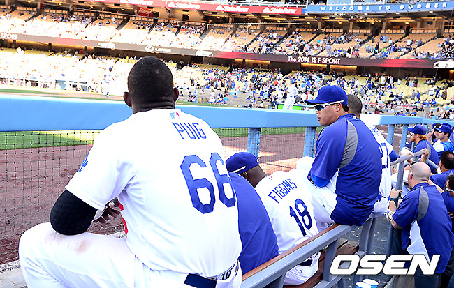 류현진을 비롯한 다저스 선수들이 더그아웃에서 9회말 공격을 지켜보고 있다./ jpnews@osen.co.kr