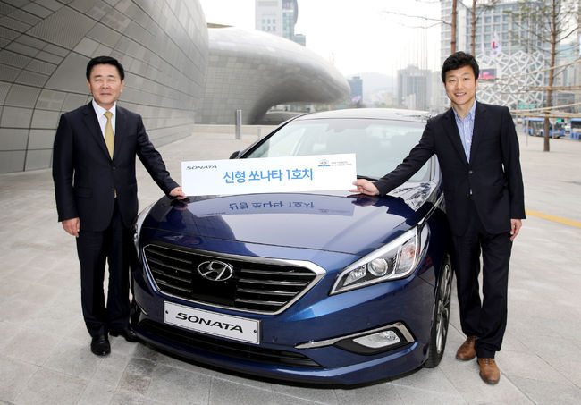 현대차는 지난 4일 동대문디자인플라자(서울 중구 소재)에서 강민호 씨와 곽진 현대차 국내영업본부장(부사장) 등이 참가한 가운데 신형 쏘나타 1호차 전달식을 가졌다.