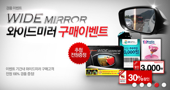 불스원 공식 온라인 쇼핑몰인 불스원몰(www.bullsonemall.com)에서 4월 23일까지 와이드미러를 구매하면 추첨을 통해 베스킨라빈스 기프티콘(50명), GS 칼텍스 1만원 주유권(100명), 불스원몰 30% 할인쿠폰(100명)을 제공한다.