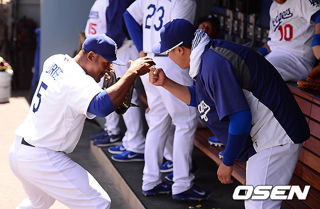 경기에 앞서 다저스 류현진, 유리베가 파이팅을 외치고 있다. / jpnews@osen.co.kr
