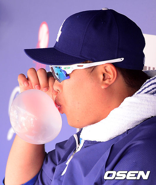 경기에 앞서 다저스 류현진이 더그아웃에서 껌 풍선을 불고 있다. / jpnews@osen.co.kr