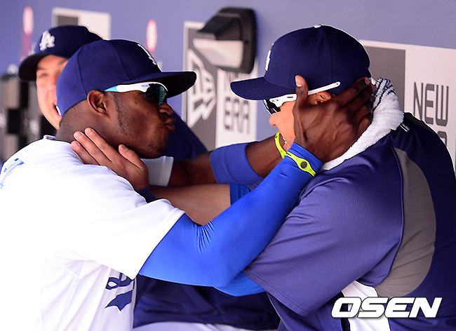 경기에 앞서 다저스 푸이그에 류현진에 키스를 하려 장난치고 있다. / jpnews@osen.co.kr