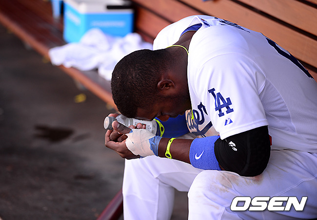 7회말 1사 만루에서 다저스 푸이그가 우익수 플라이로 물러나며 더그아웃에서 아쉬워하고 있다. / jpnews@osen.co.kr