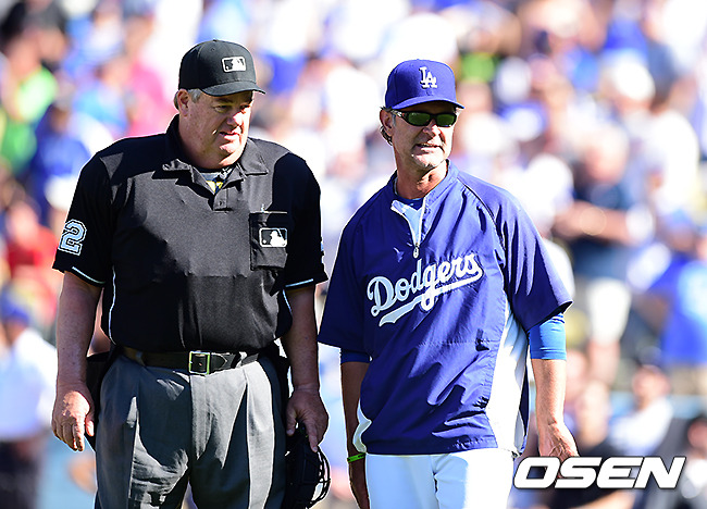 7회말 2사 만루에서 다저스 이디어의 적시 우전안타에 2루주자 엘리스가 홈에서 태그아웃당하자 매팅리 감독이 비디오 판독을 요청하고 있다. / jpnews@osen.co.kr