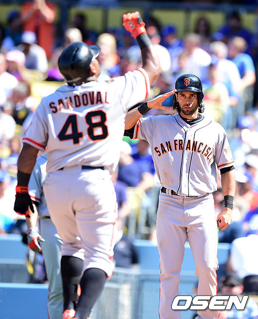5회초 1사 1,2루에서 샌프란시스코 산도발이 스리런포를 날리자 1루주자 파건이 경례를 하고 있다. / jpnews@osen.co.kr