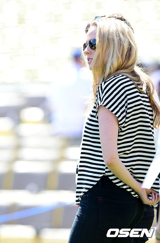 경기에 앞서 미모의 방송 관계자가 그라운드에서 훈련을 지켜보고 있다. / jpnews@osen.co.kr