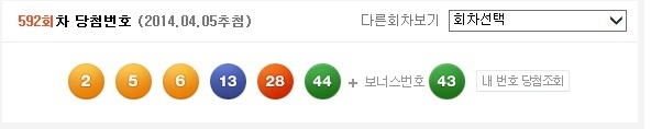 로또592회당첨번호 6일 추첨결과 1등 당첨번호는 2, 5, 6, 13, 28, 44다. 2등 보너스 번호는 43이다.