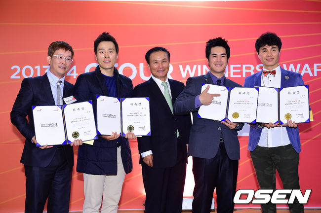 6일 오후 서울 강남구 골프존 서울본사 삼진홀에서 열린 2013-2014 GTOUR 위너스 어워드에서 G TOUR 홍보대사로 위촉된 김장렬 이훈성 변기수 리치가 포토타임을 갖고 있다.