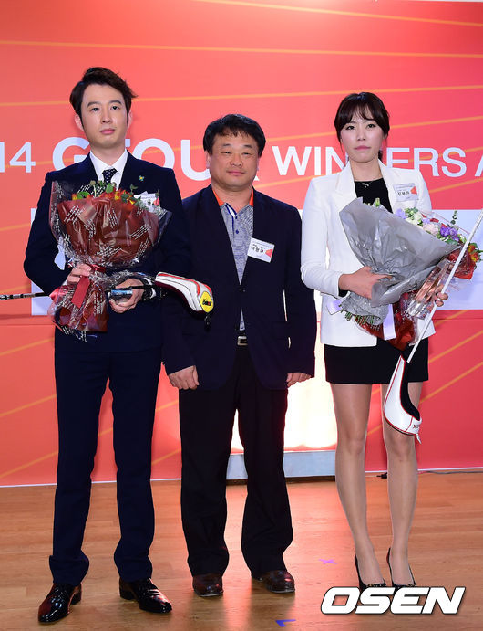 6일 오후 서울 강남구 골프존 서울본사 삼진홀에서 열린 2013-2014 GTOUR 위너스 어워드에서 G TOUR 신인왕을 차지한 김용석 장보미가 포토타임을 갖고 있다.