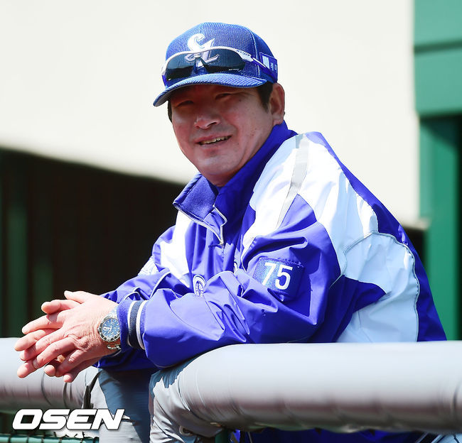 6일 오후 울산 문수야구장에서 열린 '2014 한국야쿠르트 세븐 프로야구' 롯데 자이언츠와 삼성 라이온즈의 경기, 경기 전 삼성 류중일 감독이 선수들의 훈련을 지켜보고 있다.
