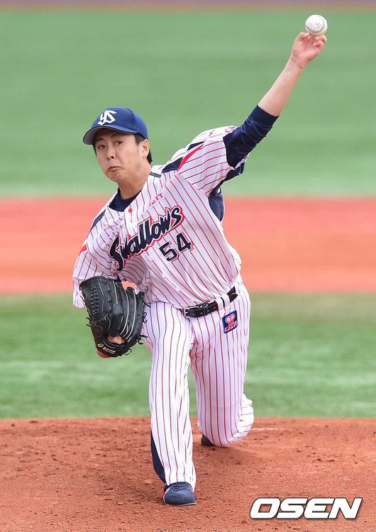 힘차게 공 뿌리는 야쿠르트 선발 나카자와 마사