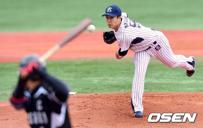 1회초 한신 공격 야쿠르트 선발 나카자와 마사토가 힘차게 공을 뿌리고 있다.