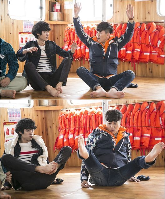 사진 속 정준영과 김종민은 서로를 바라보며 무엇인가를 시뮬레이션을 하고 있는 상태. 정준영은 김종민을 바라본 뒤 식은죽 먹기로 발로 박수를 치고 있고, 김종민은 체조인(?)답게 무아지경의 상태로 두 다리를 쩍 벌리고 있다.