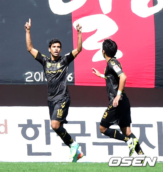 6일서울월드컵경기장에서 벌어진 FC 서울과 전북 현대의 경기 전반 레오나르도가 페널티킥으로 선제골을 넣고 최은성 코치 이마에 키스를 하고 있다.