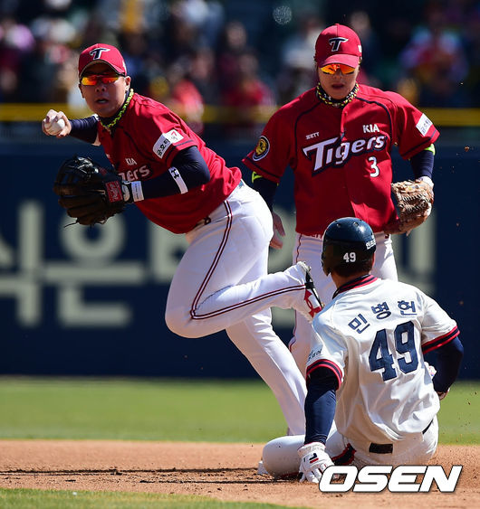 6일 오후 서울 잠실구장에서 열린 '2014 한국야쿠르트 세븐 프로야구' 두산 베어스와 KIA 타이거즈의 경기 1회말 무사 1루 오재원의 2루수 앞 땅볼 상황, 안치홍이 2루에서 민병헌을 포스아웃 시킨 후 1루를 바라보고 있다. 오재원은 1루에서 세이프.