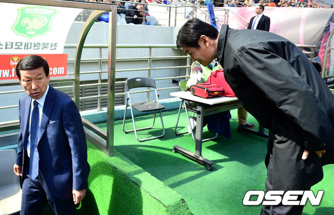 6일서울월드컵경기장에서 벌어진 FC 서울과 전북 현대의 경기 최용수 감독이 최강희 감독에 인사를 하고 있다.