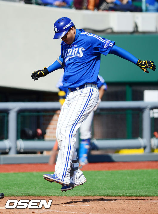 6일 오후 울산 문수야구장에서 열린 '2014 한국야쿠르트 세븐 프로야구' 롯데 자이언츠와 삼성 라이온즈의 경기, 3회 무사 주자 1,2루삼성 채태인이 송승준을 상대로 중앙 담장을 넘어가는 스리런 홈런을 날린 후 홈을 점프하며 밟고 있다. 시즌 1호 마수걸이 홈런.