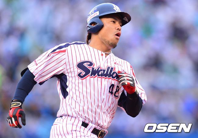 3회말 야쿠르트 공격 2사 1, 2루 상황 대타 이와무라 아키노리가 우월 스리런포를 날리고 그라운드를 돌며 환호하고 있다.