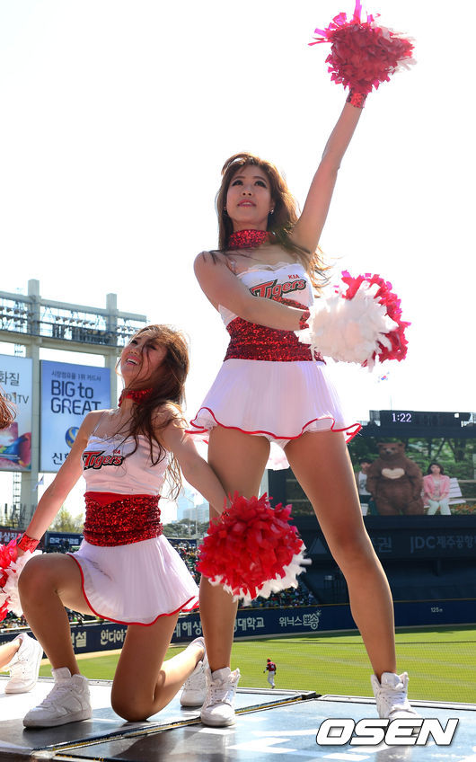 6일 오후 서울 잠실구장에서 열린 '2014 한국야쿠르트 세븐 프로야구' 두산 베어스와 KIA 타이거즈의 경기, 치어리더들이 공연을 펼치고 있다.
