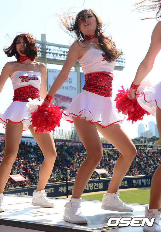 6일 오후 서울 잠실구장에서 열린 '2014 한국야쿠르트 세븐 프로야구' 두산 베어스와 KIA 타이거즈의 경기, 치어리더들이 공연을 펼치고 있다.