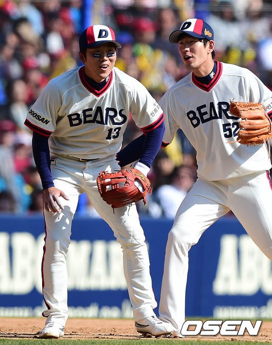 6일 오후 서울 잠실구장에서 열린 '2014 한국야쿠르트 세븐 프로야구' 두산 베어스와 KIA 타이거즈의 경기 5회초 1사 3루 김상훈의 땅볼을 놓쳤다 다시 잡아 1루로 송구 아웃시킨 허경민이 미소를 짓고 있다.