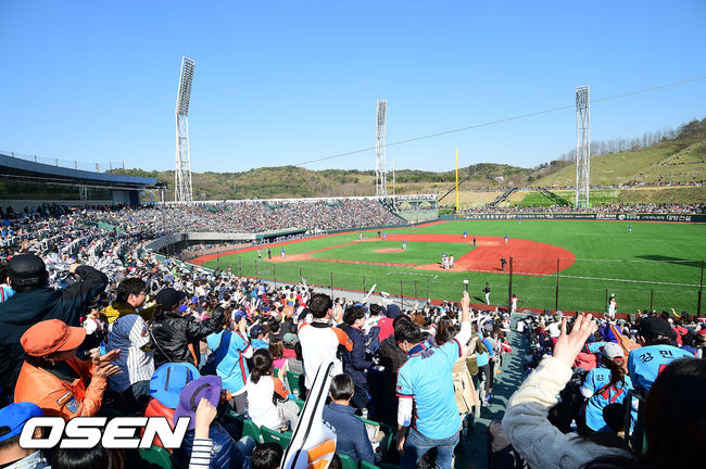 6일 오후 울산 문수야구장에서 열린 '2014 한국야쿠르트 세븐 프로야구' 롯데 자이언츠와 삼성 라이온즈의 경기, 만원 관중의 문수 야구장. 야구팬들이 열띤 응원을 펼치고 있다.