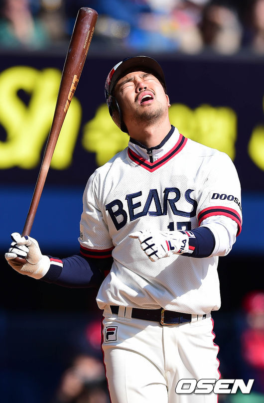 6일 오후 서울 잠실구장에서 열린 '2014 한국야쿠르트 세븐 프로야구' 두산 베어스와 KIA 타이거즈의 경기 5회말 무사 1,3루 오재원이 삼진을 당하고 아쉬워하고 있다.