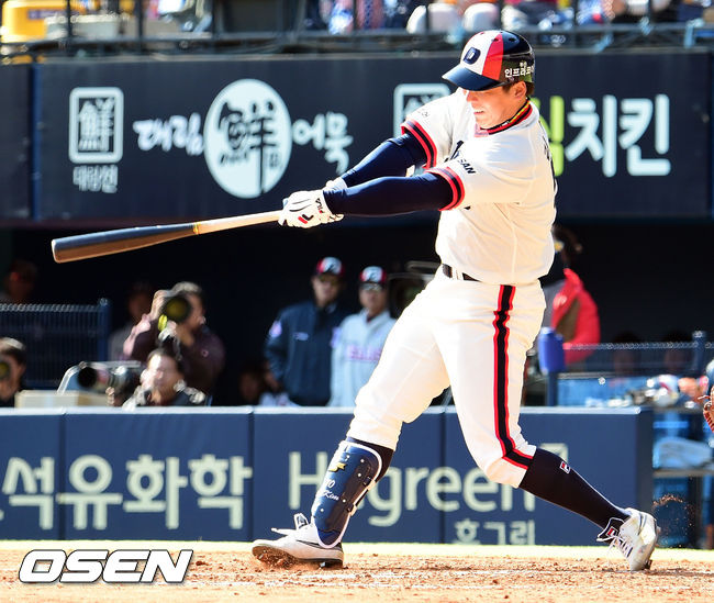6일 오후 서울 잠실구장에서 열린 '2014 한국야쿠르트 세븐 프로야구' 두산 베어스와 KIA 타이거즈의 경기, 5회말 2사 1루 김현수가 좌전안타를 치고 있다.