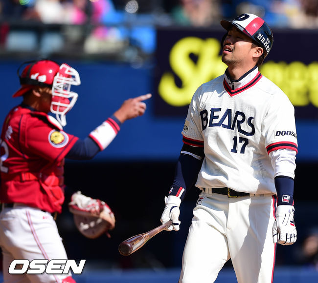 6일 오후 서울 잠실구장에서 열린 '2014 한국야쿠르트 세븐 프로야구' 두산 베어스와 KIA 타이거즈의 경기 5회말 무사 1,3루 오재원이 삼진을 당하고 아쉬워하고 있다.