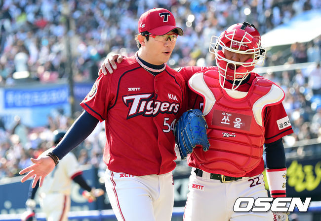 6일 오후 서울 잠실구장에서 열린 '2014 한국야쿠르트 세븐 프로야구' 두산 베어스와 KIA 타이거즈의 경기, 5회말 2사 만루 양의지를 삼진으로 처리한 양현종이 김상훈과 덕아웃으로 향하고 있다.