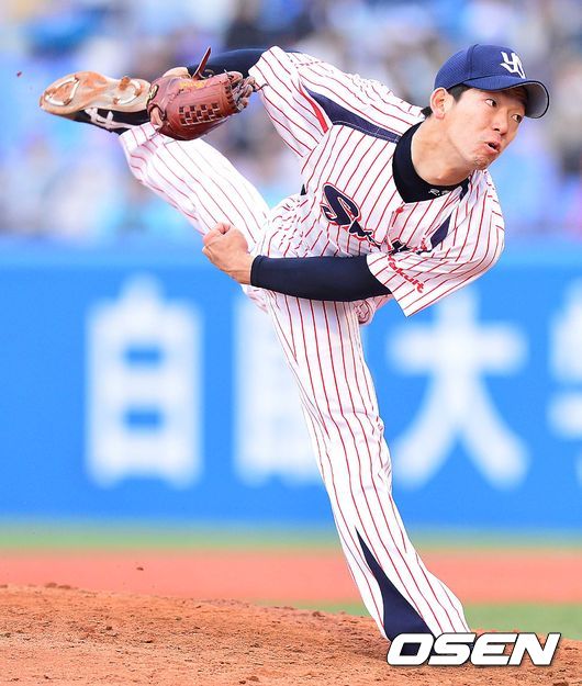 6회초 한신 공격 마운드에 오른 야쿠르트 투수 야기 료스케가 힘차게 공을 뿌리고 있다.