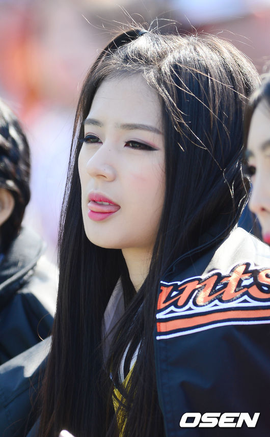 6일 오후 울산 문수야구장에서 열린 '2014 한국야쿠르트 세븐 프로야구' 롯데 자이언츠와 삼성 라이온즈의 경기, 롯데 치어리더 박기량이 무대 위에서 공연을 마친 후 휴식을 취하고 있다.