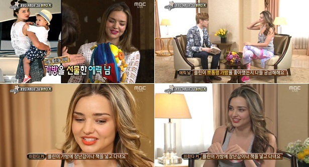 앞서 방문 당시 인터뷰 후 자신이 선물했던 뽀통령 가방을 플린이 좋아하느냐고 에릭남이 묻자 미란다커는 "(뽀통령 가방을) 좋아한다"며 "플린이 가방에 장난감이나 책을 넣어 다닌다"고 답했다.