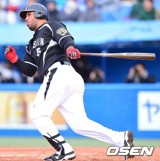7회초 한신 공격 1사 1, 3루 상황 마우로 고메즈가 추격의 2타점 좌익선상 2루타를 날리고 있다.