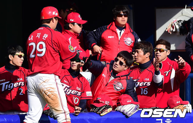6일 오후 서울 잠실구장에서 열린 '2014 한국야쿠르트 세븐 프로야구' 두산 베어스와 KIA 타이거즈의 경기 7회초 무사 2루 필의 1타점 적시타에 홈을 밟은 나지완이 덕아웃에서 동료들과 하이파이브를 하고 있다.